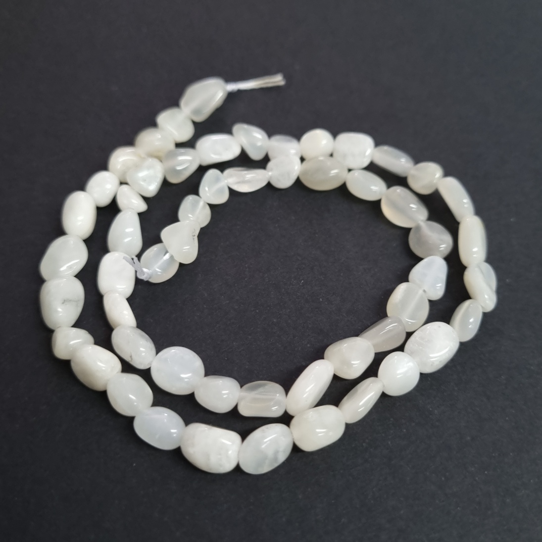 Valkoisesta läpikuultavaan, siellä täällä siniseen ja violettiin taittava välkähdys.Helmien muoto vaihtelee. Keskikoko n. 3-10 mm.Reikäkoko n. 1 mm.