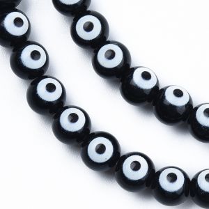 Läpivärjättyä lasia. Pinnassa kahdella puolella printattuna kohokuviona evil eye-silmä. Reiäkoko n. 1-1,2 mm.