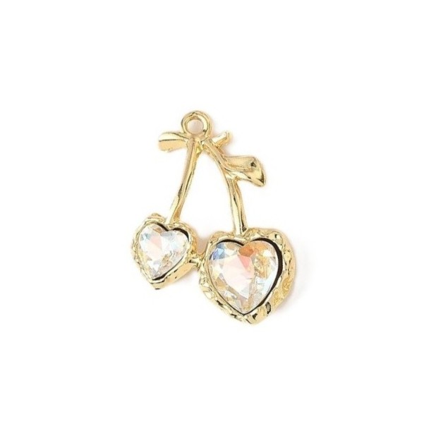 Yksipuolinen kirsikkariipus. Etupuolella sydänmenmuotoiset strassit. Ripustussilmukan sisämitta n. 1,7 mm. Kiinnitä koruun avattavalla välirenkaalla tai riipuspidikkeellä.
