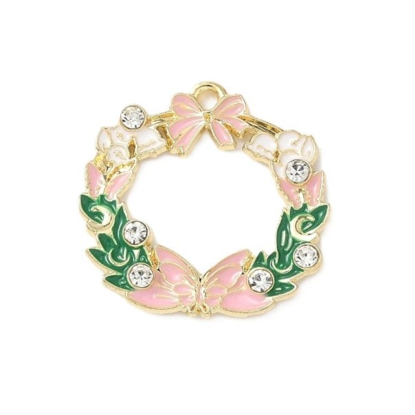 Metalliemalimaskotti kranssi rusetti/ kukat/ perhonen vaaleanpunainen / kulta /strassit 25x25,5 mm