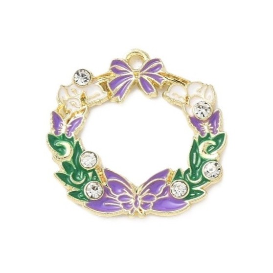 Metalliemalimaskotti kranssi rusetti/ kukat/ perhonen lila/ kulta /strassit 25x25,5 mm