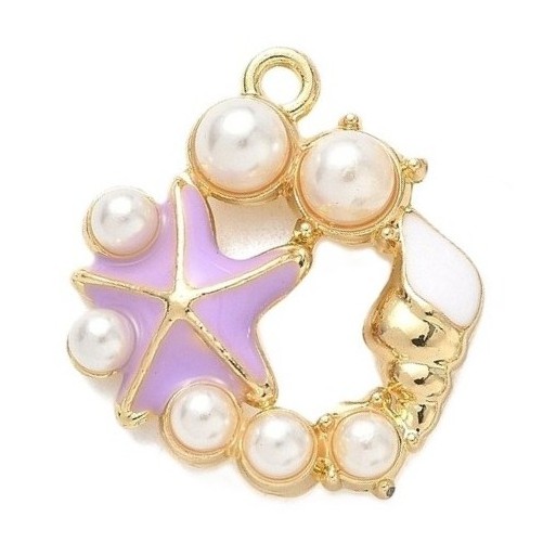 Metalliemalimaskotti 3D kranssi lila meritähti/ simpukka / helmet / kulta /strassit 25x22 mm