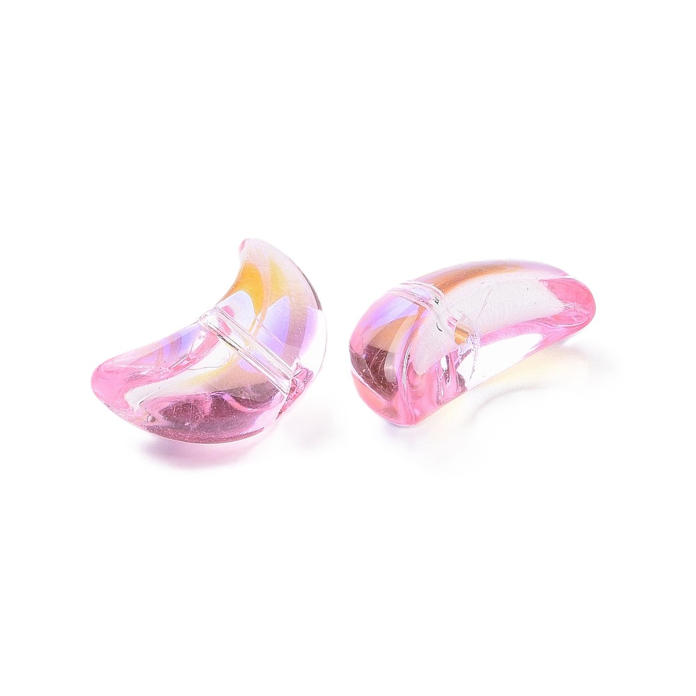 Myyntierässä 1 kpl. Läpinäkyvää, väripinnoitettua lasia. Reikä vaakasuunnassa läpi. Pujotuspituus 9 mm, helmen leveys sirpin päästä päähän 14 mm, paksuus reiän kohdalta 6,5 mm. Reikäkoko n. 1,2 mm. Kuunsirppihelmet sopivat monenlaisiin koruihin joko suoraan pujotettuna tai korupiikin avulla roikkumaan.
