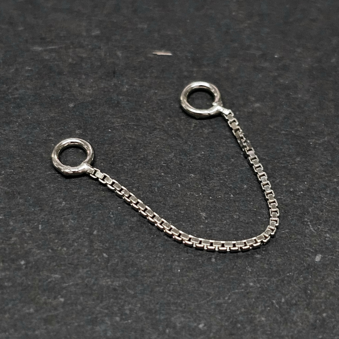 Valmis 3 cm ketju, jonka molemmissa päissä juotettu silmukka. Sopii käytettäväksi magneettilukkojen turvaketjuna. Sterlinghopea ei ole magneettista, joten ketju ei takerru lukon väliin. Ketjun paksuus n. 0,8 mm.