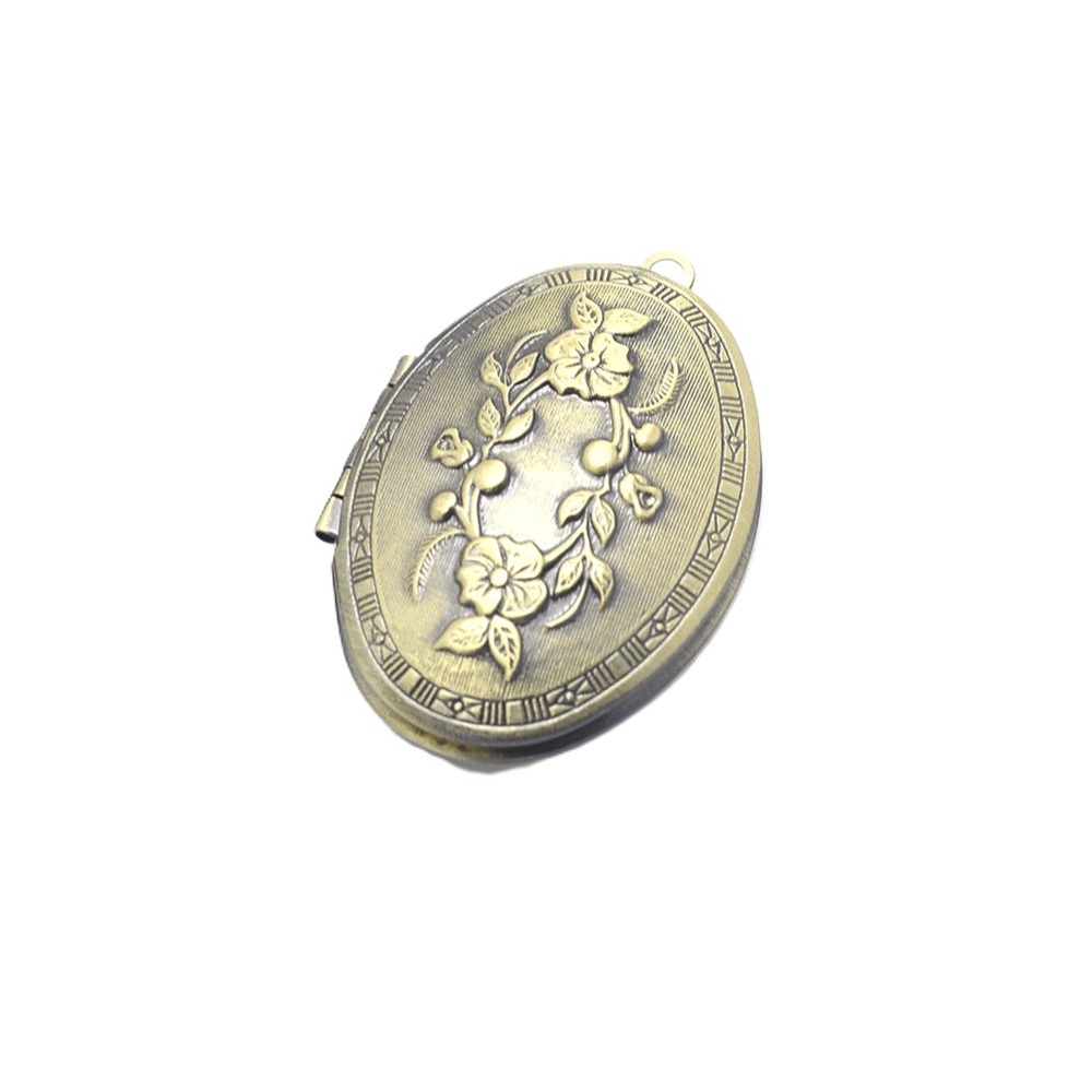 Metalliriipus ja lukko avattava medaljonki litteä, kukkaköynnöskuvioitu ovaali antiikkimessinginvärinen 42x27mm