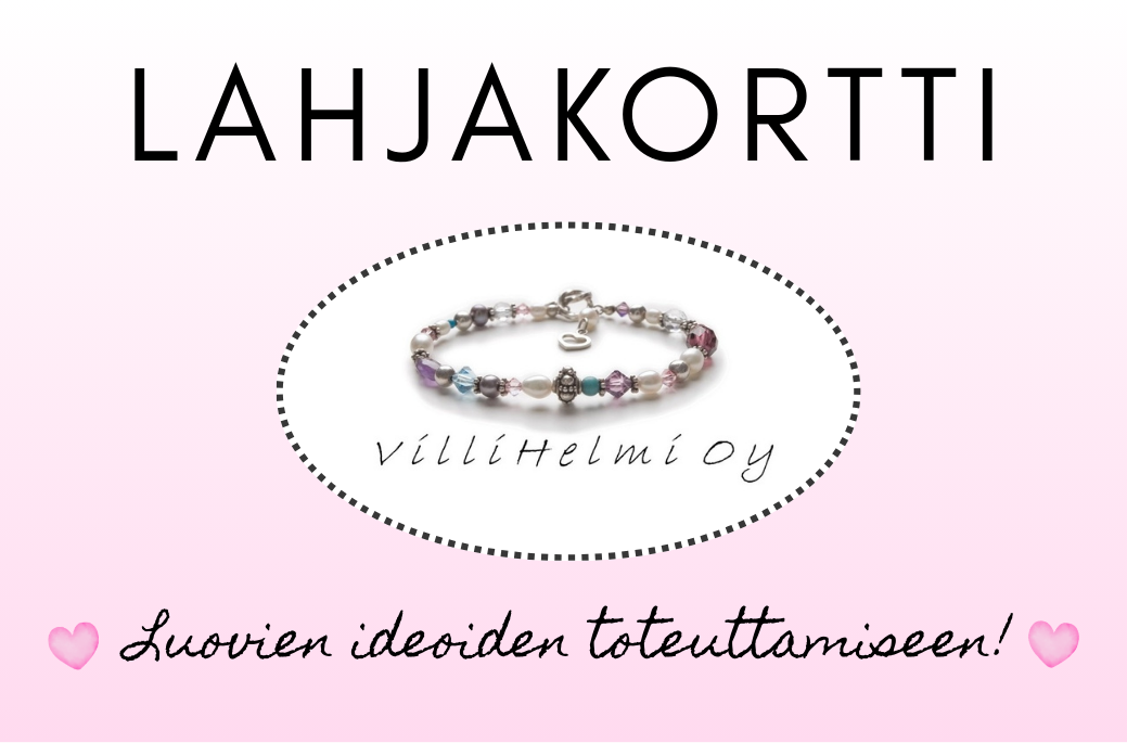 Lahjakortti kelpaa maksuvälineenä voimassaoloaikanaan valintasi mukaan joko VilliHelmi Oy:n myymälässä Asematie 4-10, 01300 VANTAA tai verkkokaupassa www.villihelmi.fi